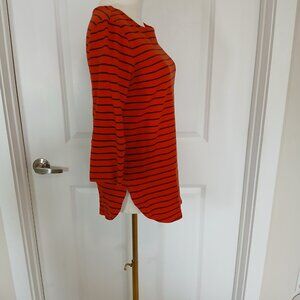 This Merona women’s tunic top is designed in a bold red color with black horizontal stripes. It features long sleeves, a classic crew neckline, and a back zipper closure for easy wear. The tunic-length cut offers a flattering fit that pairs well with leggings, jeans, or skirts. Made of 97% cotton and 3% spandex, the fabric has a soft feel with a comfortable stretch.