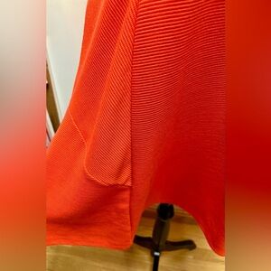 This elegant orange ribbed dress is perfect for any occasion. It is pleated on each side to add flare to the skirt. It also has a zipper in the back so it has a fitted look. Its vibrant color and stylish design make it a must-have in your wardrobe. This dress is new with tags still attached.