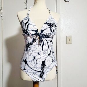White, black, and gray floral one piece swimsuit. Pre-owned in in good fair condition. Has a couple of minor imperfections as pictured. Please refer to pictures for best description and condition verification.