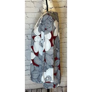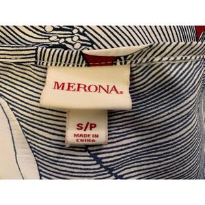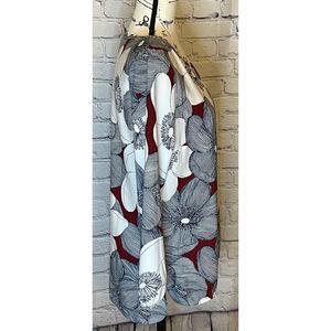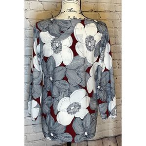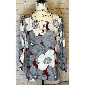 This is a great versatile long sleeve blouse from Merona. It has a V-neck with a navy, white and red floral print. You can dress it up with a skirt or slacks, or down with a pair of jeans. Material is 100% polyester.
