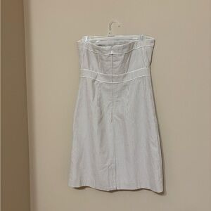 Keywords: Merona, strapless dress, A-line, knee-length, gray, striped, casual, summer, seersucker, petites, pullover, women's fashion, pre-owned, small size.