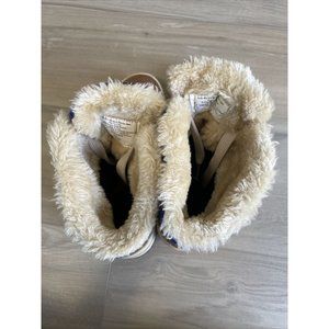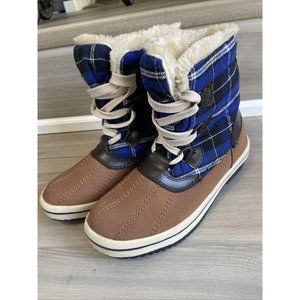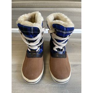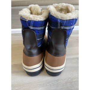 Merona Women's Short Winter Boots Tan And Blue Plaid Duck Boot Fleece Size 7.