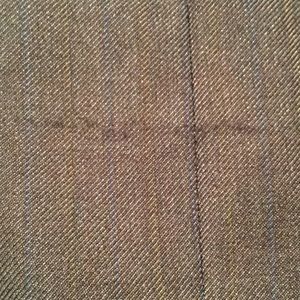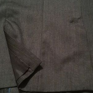 Merona brand. Size 2. Charcoal with blue and taupe vertical pinstripes. Two button front closure. Lined. Slight marking on back of blazer (see extreme close up in the last pic, also for color detail).