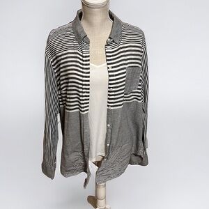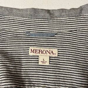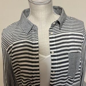 Merona shirt with long sleeves, front hidden buttons. Horizontal blue stripes. Left bodice pocket. Easy care fabric size large .