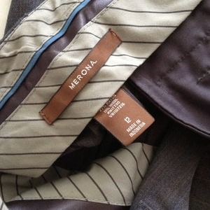 Merona jacket charcoal stripped size 16 matching pants size 12. Material polyester, rayon and wool.
