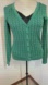 V neckline with metallic threads for sparkle throughout sweater. Buttons are a green glass with silver tone backs.