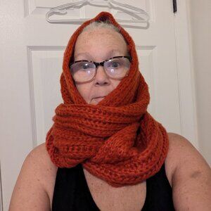 100% acrylic infinity scarf in great condition. Color is closest to what I'd call rust. Long enough to wrap over you head (don't judge my horrible cameo🤣) unisex