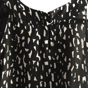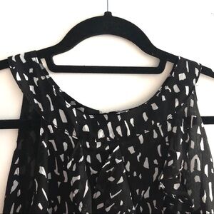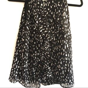 Morona chiffon sleeveless blouse with high neck and ruffled detail on the front. The pattern is like animal print, black and white. Keyhole/ button closure on the back.