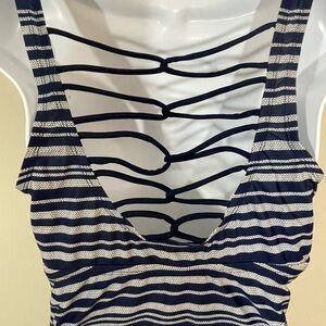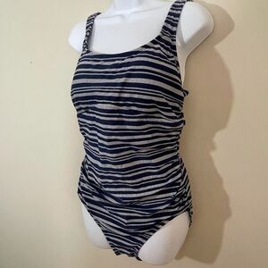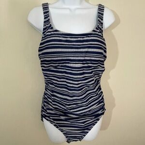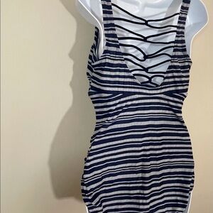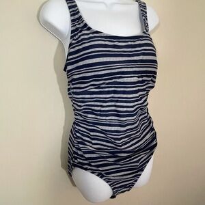 Very cute swimsuit in a stripe There are gathers on the front so it doesn’t cling to you. On the back there is a stretchy cording that helps shape the suit. The cording is not stretched out. Super cute on especially the back. No visible flaws. Any questions please ask. Will answer questions as soon as possible. D