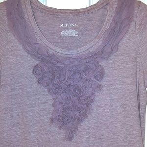 Pretty, heathered plum top. Intricate, deeper hued, frayed chiffon decorate both the neckline and front of the shirt. NWOT. 100% cotton. Hand wash cold. Lay flat to dry. No trades.