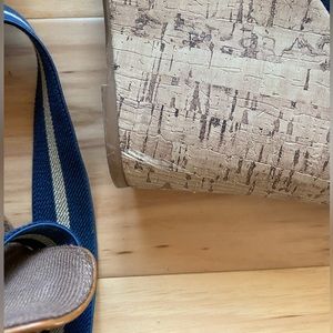 Navy blue wedges with faux cork heel and elastic straps.