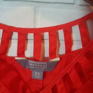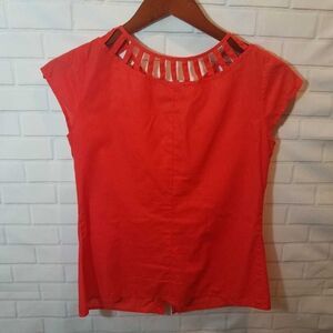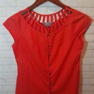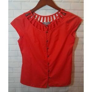 Cute blouse with pretty detailing at neckline. 8 buttons down the front and cap sleeves. Excellent condition.