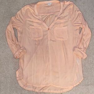 This is a pretty peach top with a flattering neckline from Merona. Two front pockets. Open neckline with one button. Sleeves can be partially rolled up or worn down. Worn twice