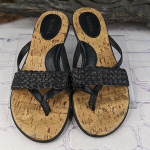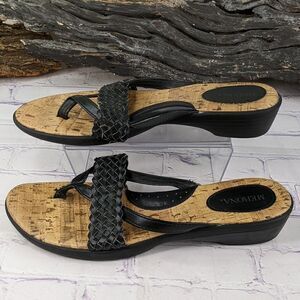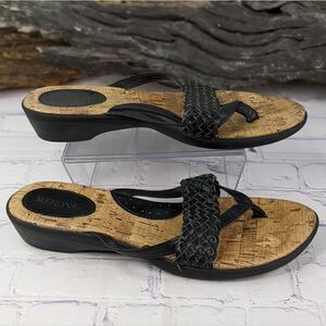 Merona thong sandals with beautifully braided woven straps on the vamp! Cork footbed and a slight wedge heel. Very comfortable. Looks perfect with a dress, shorts, capri pants, leggings or jeans!