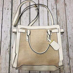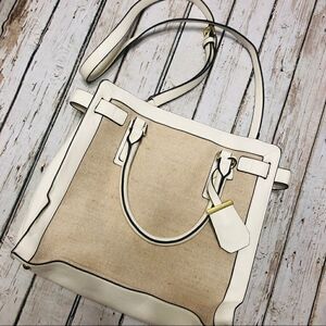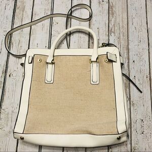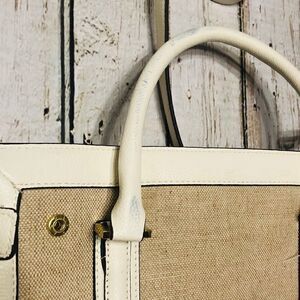 Merona Mini Belted Tote Faux Leather Handbag with Canvas Detail. Blue staining on hand of the bag. May can be removed. Otherwise in good condition