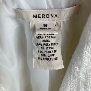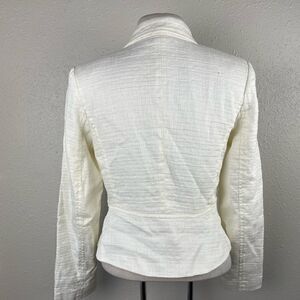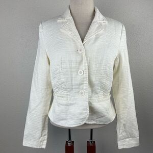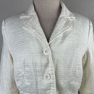 Super cute slightly cropped ivory linen blend jacket by Merona measuring 17 inches armpit to armpit laying flat and 22 inches in length from shoulder to hem.