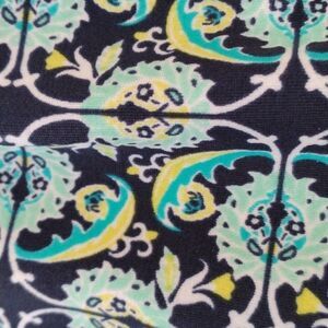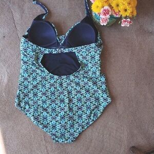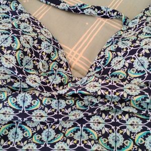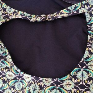Pretty arabesque design. Built in bra. Crossover fabric under chest. Halter straps at neck. Back snap at bra height. Full coverage bottom. Fully lined. Size XL.