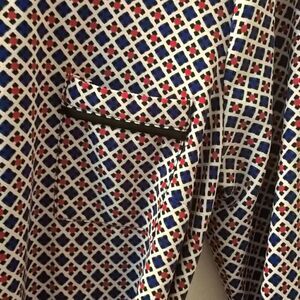 This little midi dress is red and blue on cream and size x/s. Trimmed with faux leather at the pocket on the left chest and the cuffs of the 3/4 sleeves. Constructed of 90% polyester and 10% spandex making it very comfortable. It has a tie at the waist you can tie at your comfort. A subtle band at the hem of red, blue and cream striping.