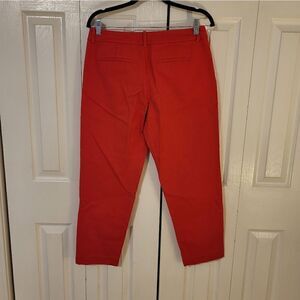 Merona red stretch ankle pants, size 8, 97% cotton 3% spandex, left front pocket, faux right front pocket, 2 faux back pockets, 1 button 2 slip clasp 1 zipper closure, excellent condition.
