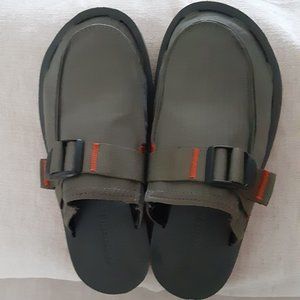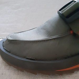 Army green, lined nylon material with orange stitching and striping; hiking treads and breather slits all around front and sides. Size 6. If you like Merrells...these are for you! NWOT