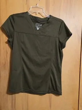 Brown Merrill capsule T-shirt with floral design on upper left chest. Bust measurement is 38 in.