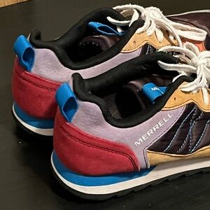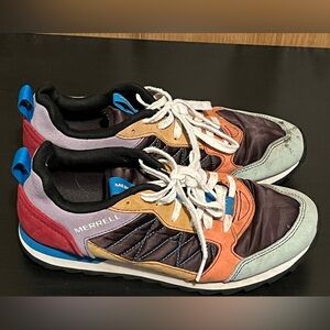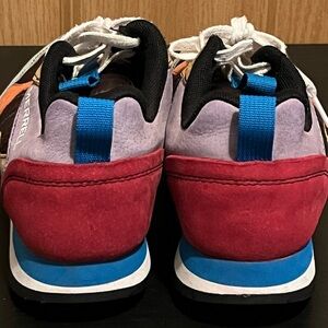 With a unique multi colored pig suede upper, the Merrell Alpine sneakers are a vibrant yet easy to pair runner silhouette for any sneaker rotation. With red, blue, orange, and tan suede panels, the trail-inspired runner is perfect for casual wear; as a lightweight EVA midsole design is paired with an exaggerated rubber outsole combining style and functionality. The look is complete with black mesh made from recycled materials along the ankle, sidewalls and toebox, while blue accent stitching and webbed pull tabs add another dimension of contrast.