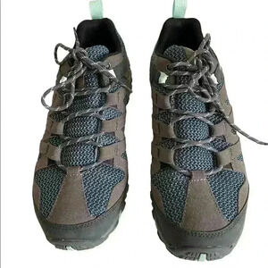 Merrell Alverstone Hiking Shoe. New in box. Women’s size 11. EUR Size 42.5. Color: Charcoal. Style: J52860. Suede leather and mesh upper. Lace closure. Protective rubber toe. Breathable mesh. Never worn. Pet free smoke free environment.