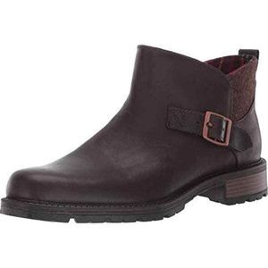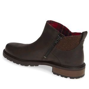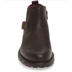 A rugged bootie with a buckle-strap detail and felt inset in back stands up to stormy weather in waterproof leather with a lug sole for traction.