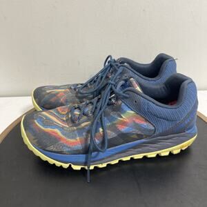 Pre-owned. Excellent condition with light wear to outsole and minimal signs of use throughout. Uppers are clean and vibrant. Features breathable mesh upper, multicolor Vibram® outsole, and QForm2™ cushioning for trail comfort. Unique rainbow design adds standout style.