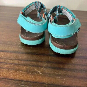 Fair condition--They've been worn, so there is some fading and dirt on the footbed (see photos). The footbed is dark bc they were worn in water. Also, there is a little fuzziness on the strap by where the Velcro is from it catching when they are strapped. Check photos carefully. They have tons of life left, but these have been worn.