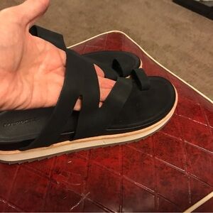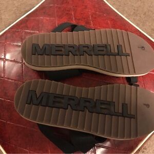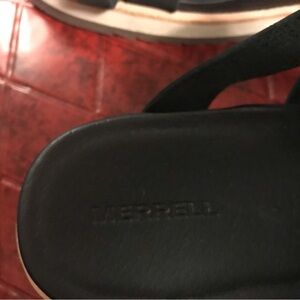 Experience the perfect blend of comfort and style with these Merrell black sandals. Featuring a sleek slip-on design with wide Leather straps these sandals offer a minimalist and contemporary look. The layered sole with a slight platform height size 10