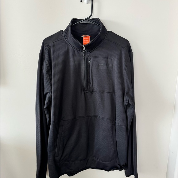 Sleek black performance jacket. Half-zip design. Lightweight and breathable. Ideal for outdoor activities.