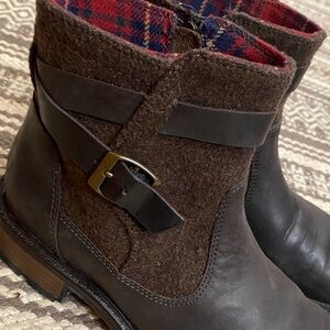 Merrell boots with a black and brown exterior. Zipper sides Features a rugged sole and plaid interior for added style. 60% Wool Uppers. Very good condition