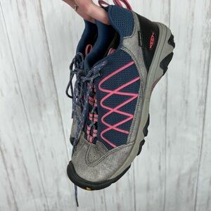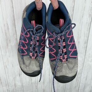 Stylish Keen hiking shoes. Features a blue mesh upper with pink accents. Durable and comfortable for outdoor adventures. Gently preloved in great condition with minor wear. Worn probably 4 times.