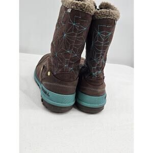 Women's Size 8 Merrell Boots, Zippers at the front, brown waterproof suede with teal turquise embroidered design.