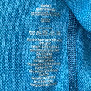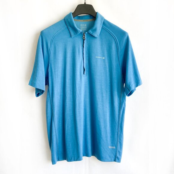 Blue collared polo from Merrell has raglan-set short sleeves, zip closure with branded pull, logo on front chest and back small zip pocket. 66% Merino wool with nylon.
