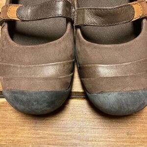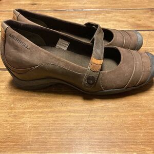 Merrell Eden MJ wedge loafers. Size 7 1/2. Mary Jane style. Brown leather. Rubber on toe is slightly faded from cleaning. Good preowned condition. See pics for condition.