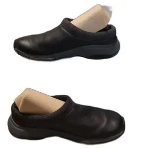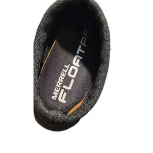 Merrell Float Pro clog style shoes with leather upper and knit fabric opening. Slip on style. Color is very dark brown or almost black. Good pre-owned condition besides some wear as I tried to show in photos.