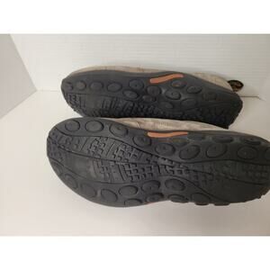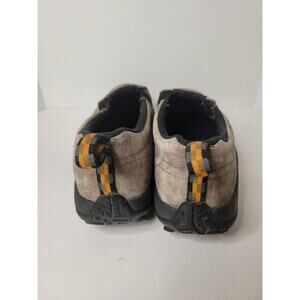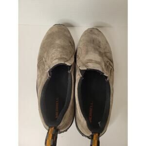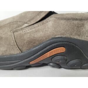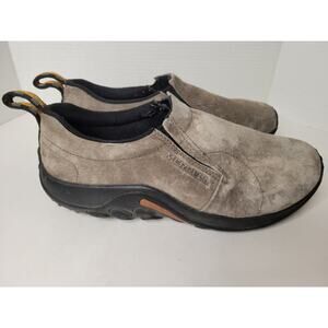 These are a pair of classic Merrell Jungle Moc slip-on shoes in a gray/taupe suede. This is a durable and comfortable shoe, perfect for everyday wear. The shoes are a men's size 12W. They are pre-owned with signs of wear, including some scuffing and discoloration on the suede, as shown in the pictures. The soles and interiors are in good condition.