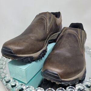 Merrell Kangaroo men’s slip-on hiking shoes in size 12 combine trail-ready grip with the convenience of a casual sneaker. The rich brown leather upper and elastic side gores make them easy to slide on and off, while still holding the foot securely on walks, light hikes, or around town. A cushioned insole and supportive midsole help absorb shock and keep feet comfortable for all‑day wear, and the rugged rubber outsole provides reliable traction on dirt paths, park trails, and city sidewalks.