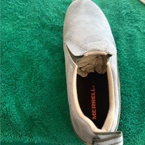 Comfortable Merrell mules in light gray. Slip-on design with durable sole.