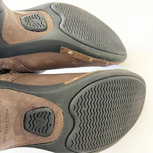 Merrell Luxe Mid ankle boots size 7.5. Color is bitter chocolate with brushed metallic accents and studded details. Gorgeous oil rubbed leather. Side zip. 2” heel. Rubber grip soles. These boots are perfection! Preowned, very light overall wear.