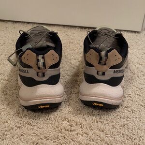 Stylish Merrell athletic shoes. Beige and black design. Perfect for active wear. Vibram outsoles