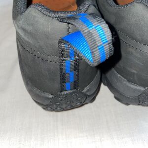 This mens black leather pair of Merrell safety work shoes have little wear! One of the stretch bands on one shoe is broken. Probably not an issue for wear.