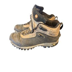 Keywords: Merrell, Thermo 6, snow boot, men's footwear, winter boots, waterproof, insulated, activewear, synthetic material, rubber outsole, lace-up, black boots, pre-owned, size 8.5, round toe.