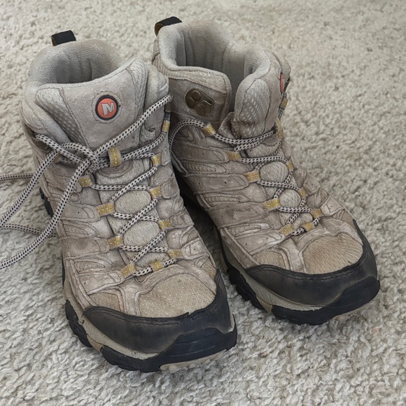 Sturdy Merrell boots for hiking. Features a rugged design. Ideal for outdoor activities.