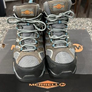 Gently used, grain Leather breathable mesh upper, waterproof, slip resistant, composite safety toe and air cushioned heels are just a few of the attributes of this boot!