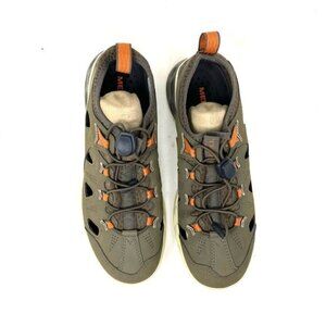 Durable men's sandals by Merrell. Olive with orange accents. Comfortable and stylish.