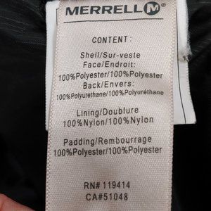 Merrell Black Opti Warm Men’s XL Winter Jacket. Zip and snap closure. Really nice condition no show of wear such as holes or tears, but there is a small mark on snap flap as shown in 5th photo. The mark did not come off in the wash.