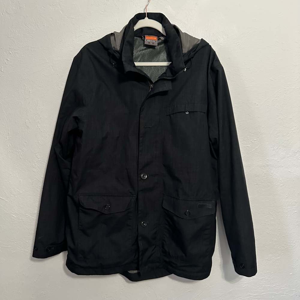 Pockets: The jacket has multiple front pockets, including two with button closures. Internal pockets.